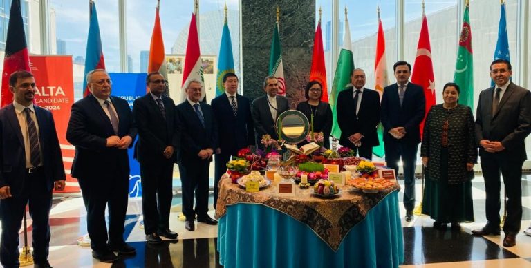 سفرا و نمایندگان ۱۲ کشور حوزه نوروز، سه شنبه به وقت محلی بر سر سفره هفت سینی که توسط نمایندگی ایران در مقر سازمان ملل متحد برپا شده بود، گرد هم آمدند تا این عید باستانی را جشن بگیرند.